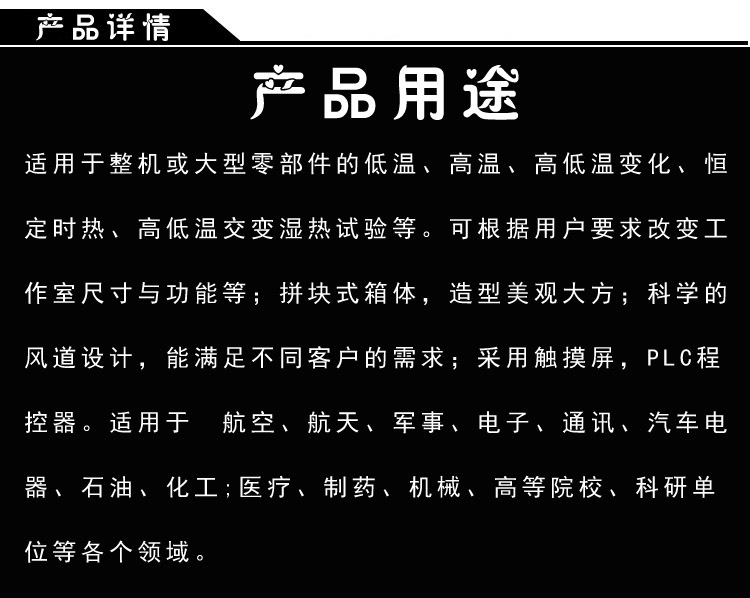 適用于整機或大型零部件的低溫、高溫、高低溫變化、恒定時熱、高低溫交變濕熱試驗等??筛鶕脩粢蟾淖児ぷ魇页叽缗c功能等;拼塊式箱體,造型美觀大方;科學的風道設計,能滿足不同客戶的需求;采用觸摸屏,PLC程控器。適用于 航空、航天、軍事、電子、通訊、汽車、電器、石油、化工;醫療、制藥、機械、高等院校、科研單位等各個領域;